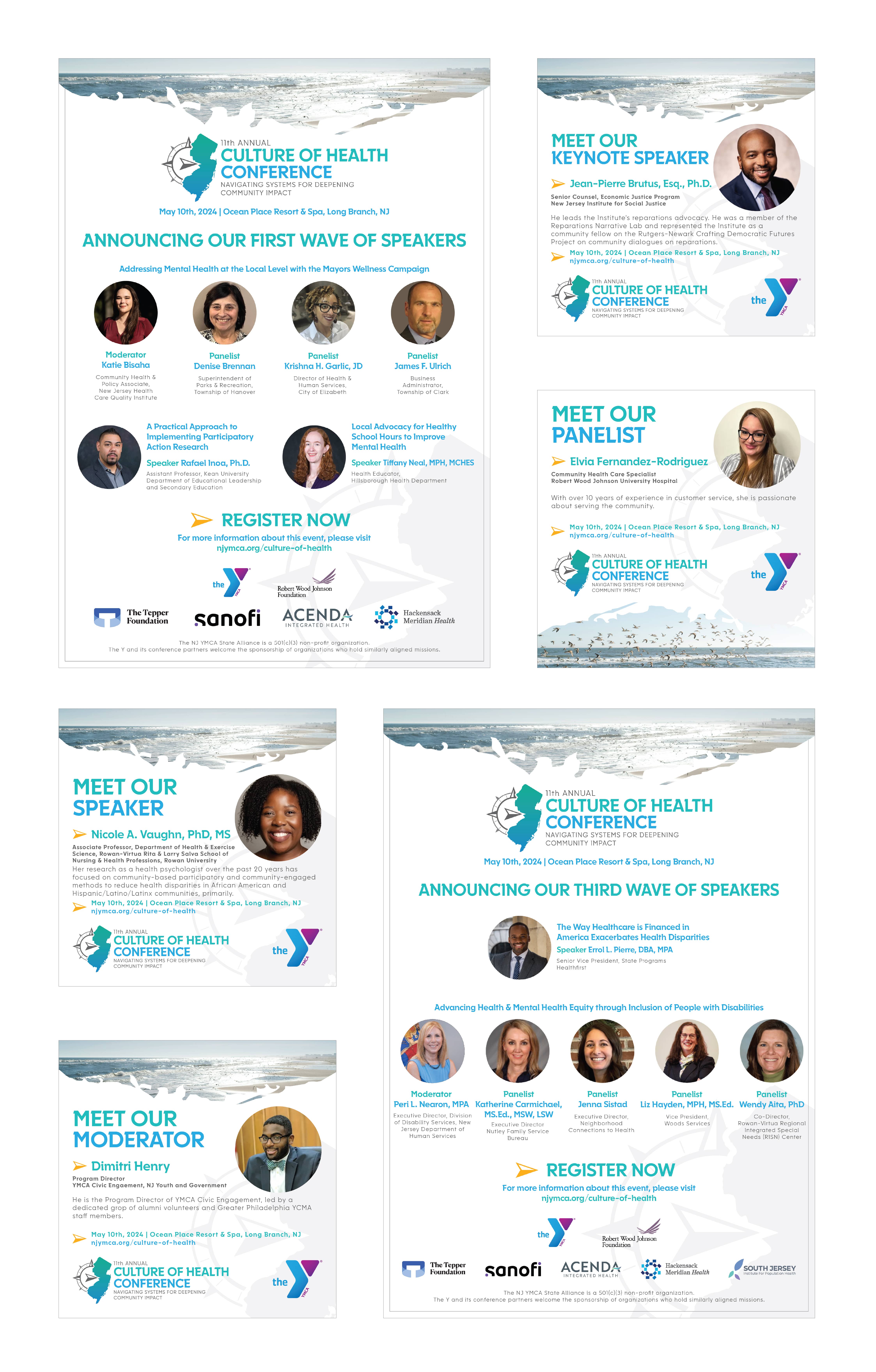 For their conference, the first introduction of the conference is often to prospective sponsors to help get the conference going. We completely revamped their Sponsorship Prospectus and I fleshed out more of the design elements for the new 11th Annual Culture of Health Conference brand. I found photos of true Jersey Shore spots to feature throughout the branding, along with pulling out the compass element from the logo and placing it throughout various parts of the branding as its own standalone item. To drive (another pun intended) the point home, I masked photos of the Jersey Shore with a vector outline of the Jersey Shore as a visual element for photos throughout the branding.