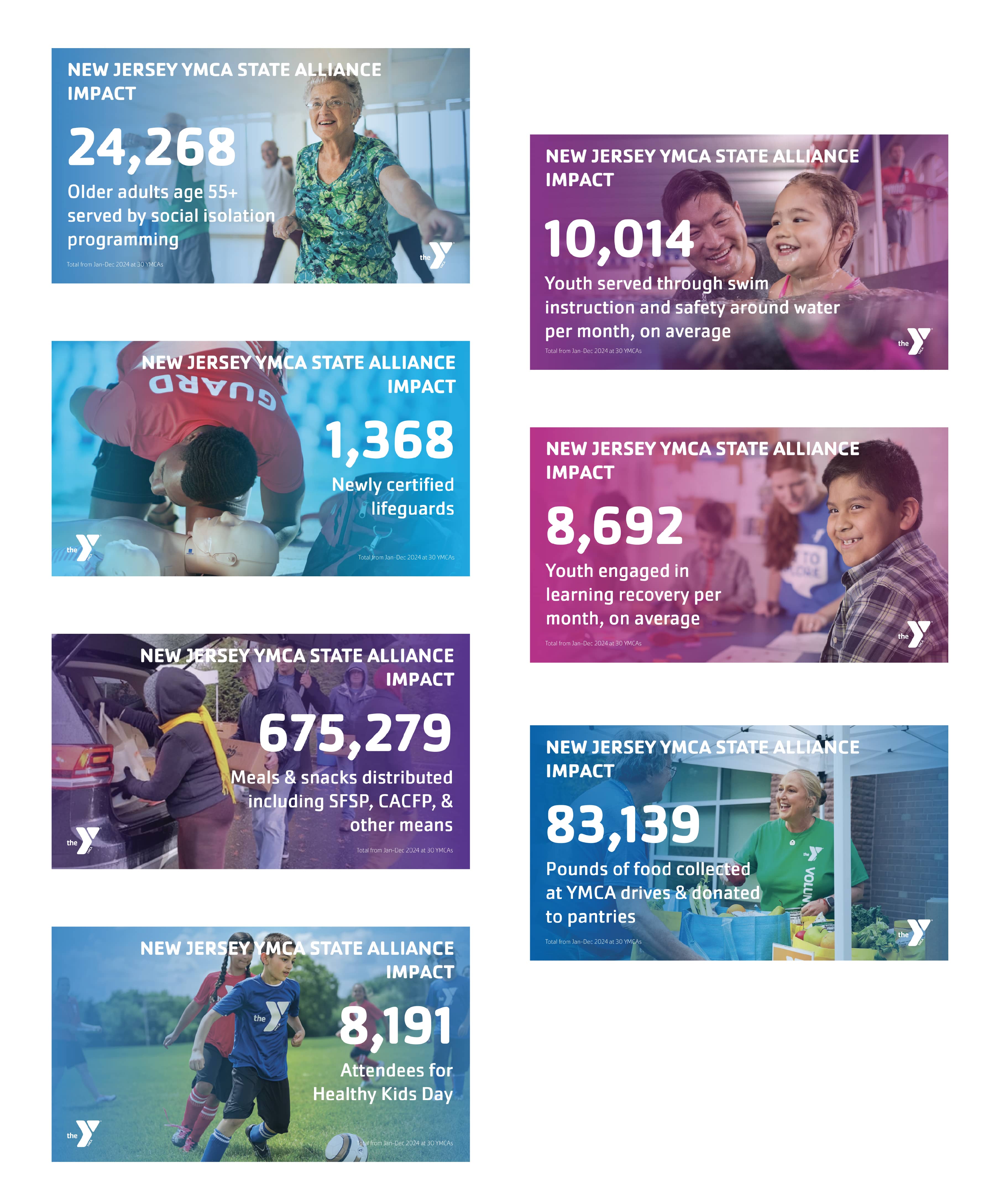 The next set of slides I wanted to focus on was their impact slides. I felt these were extremely important to show just exactly their reach and their impact statewide. The goals for these slides were to stay consistent with the Y blue/purple color scheme the NJ YMCA State Alliance uses and the design aesthetic we've been using for them so far, and to make these visuals very eye-catching and appealing.